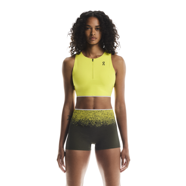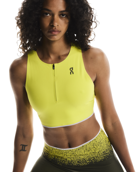 Breathable and soft crop top for race day, with a hybrid racerback construction for a stable and secure fit.